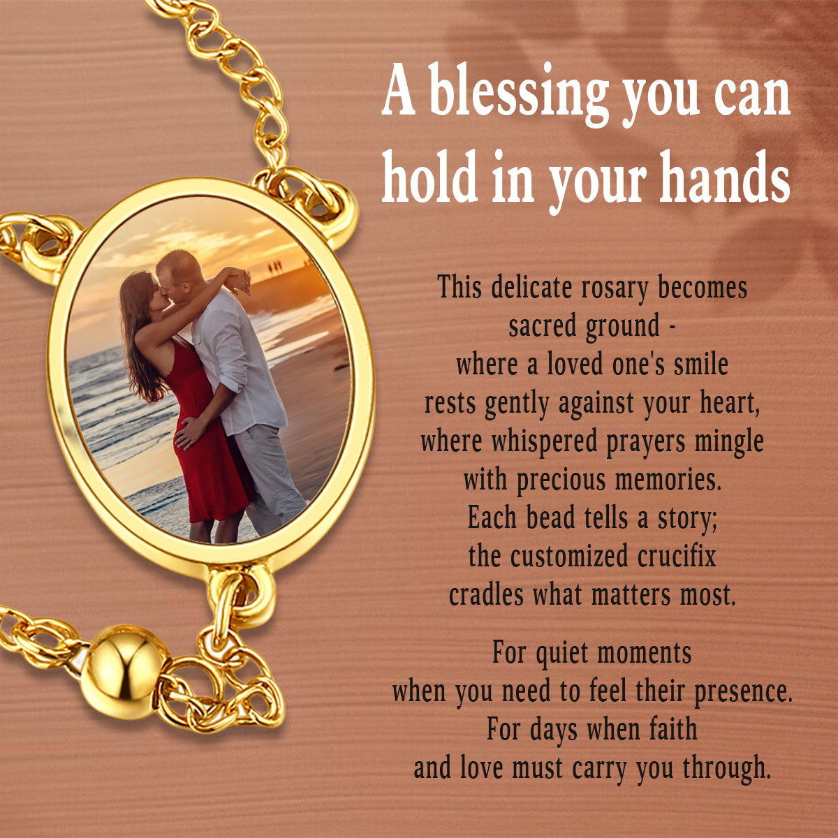 This personalized rosary necklace cradles your loved one's image within the cross, turning prayer into a sacred reunion. Handcrafted with smooth beads that glide through fingers during Hail Marys, it's wearable comfort for both spiritual practice and daily remembrance.